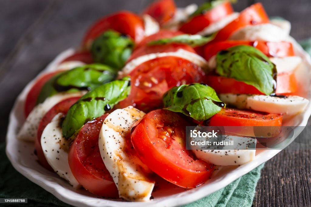주 재료는 신선한 토마토, 모짜렐라 치즈, 바질잎 등의 구성으로 발사믹 드레싱을 주로 곁들여 먹습니다.