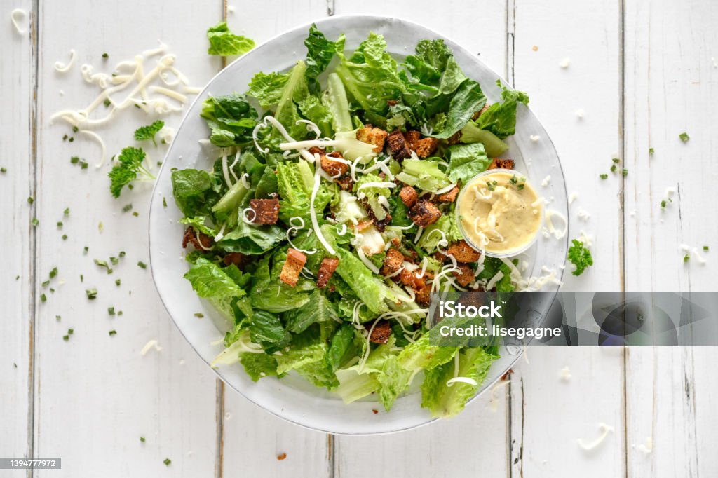 시저 샐러드는 시저 카디니의 이름을 딴 샐러드 이름으로 로메인 양상추, 크루통, 파르메산 치즈, 마늘, 멸치, 달걀노른자, 올리브 오일, 레몬즙(주스), 그리고 우스터소스를 베이스로 하는 드레싱을 이용하여 버무린 샐러드입니다.