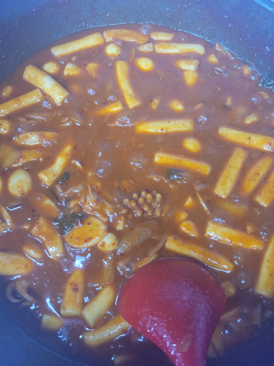 7. 떡볶이 떡과 양념을 절반 넣고 잠기고도 남을 만큼의 물양에서 졸이기 시작합니다.