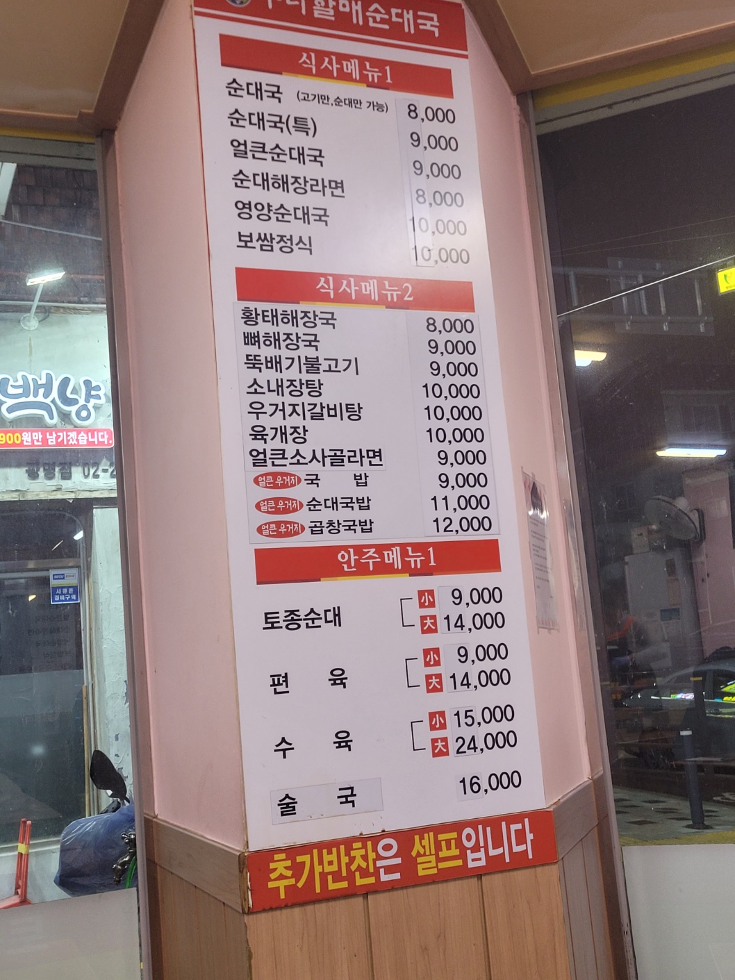 가격표를 보면 바로 이해 가실 거예요 9 요즘 너무 착한 가격이죠, 그리고 식사류를 드시면 공깃밥은 무한리필이라고 합니다) 저기 적혀 있는 공기밥 1,000은 식사 외 다른 메뉴 드시는 분들이 시키면 그때 추가로 발생한다고 하니 참고 부탁드려요!! 그리고 순댓국집은 술이 빠질 수 없는 친구와도 같은 존재인데요
